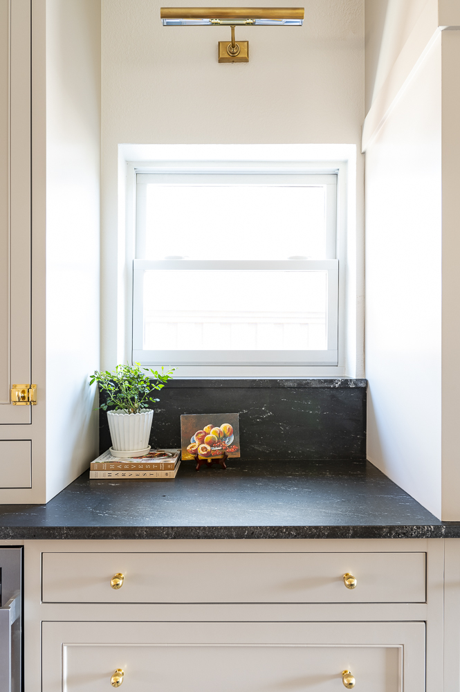 Although the footprint of this kitchen is not big, it packs a serious punch with all its details! The custom inset cabinets were tailor made to the clients preferences and the layout was completely transformed to maximize every inch of this space for a better workflow. The island has a custom stain that was made specifically for this project and complete with a marble countertop and sweet little recessed nook for all her favorite cookbooks and dishware.
