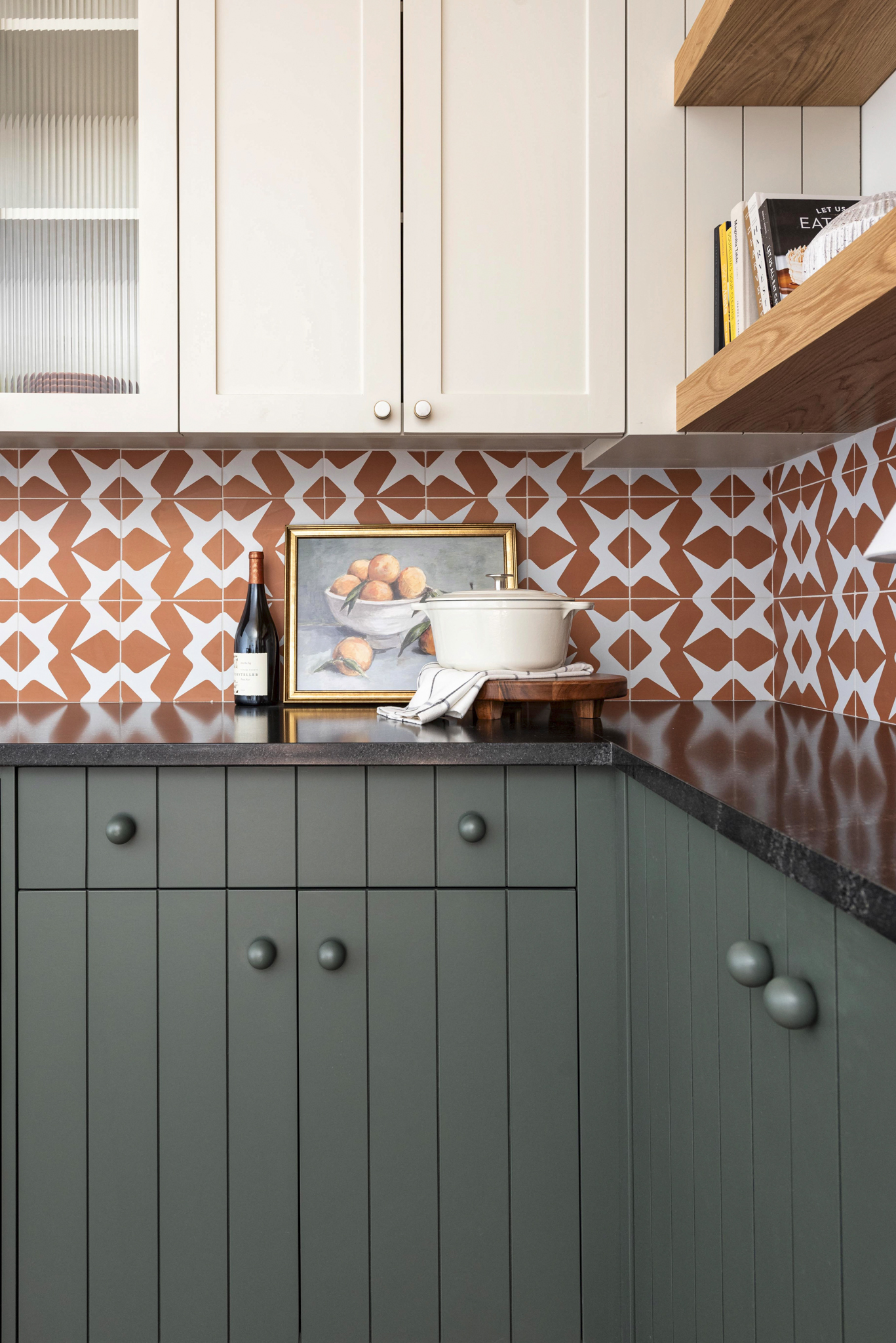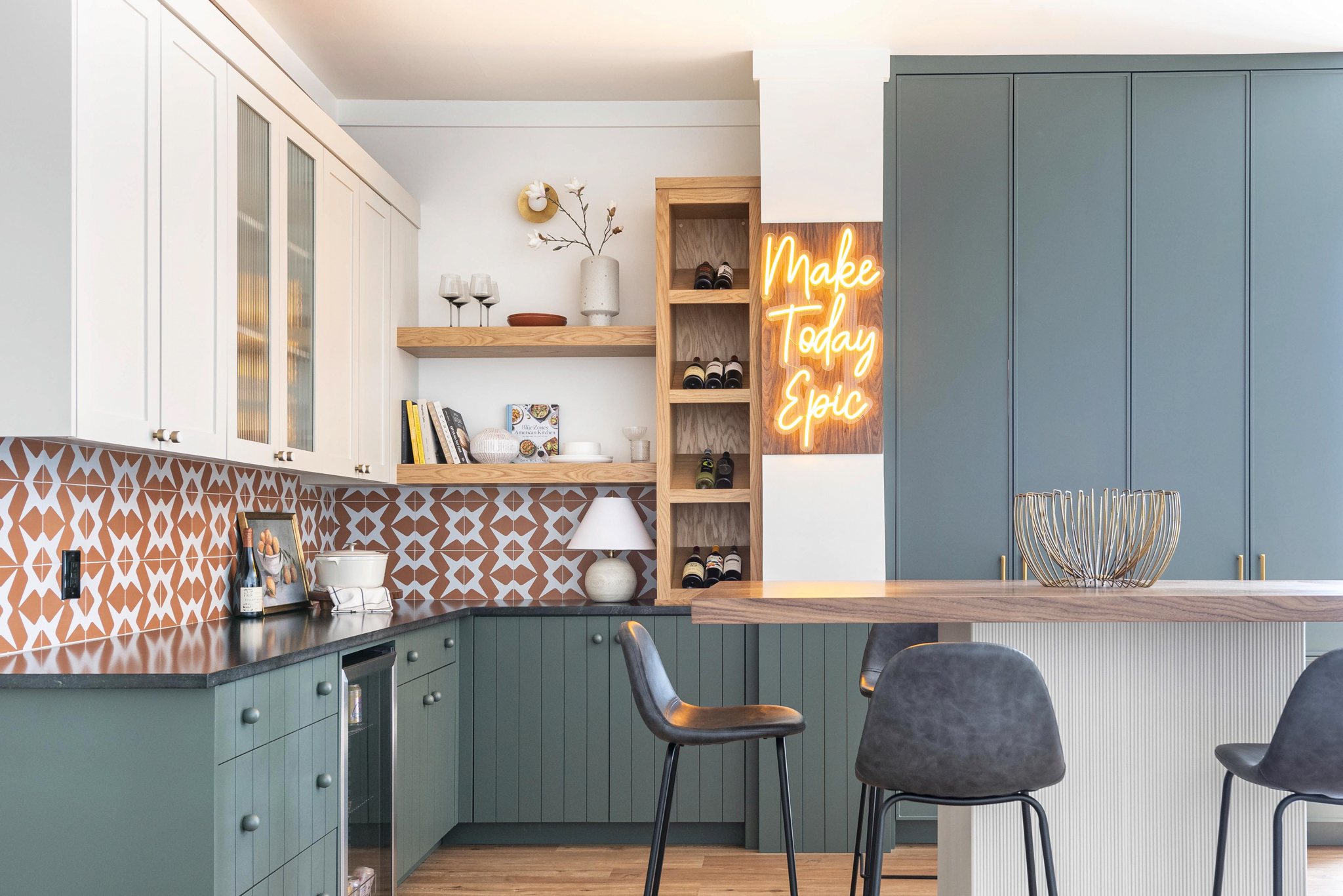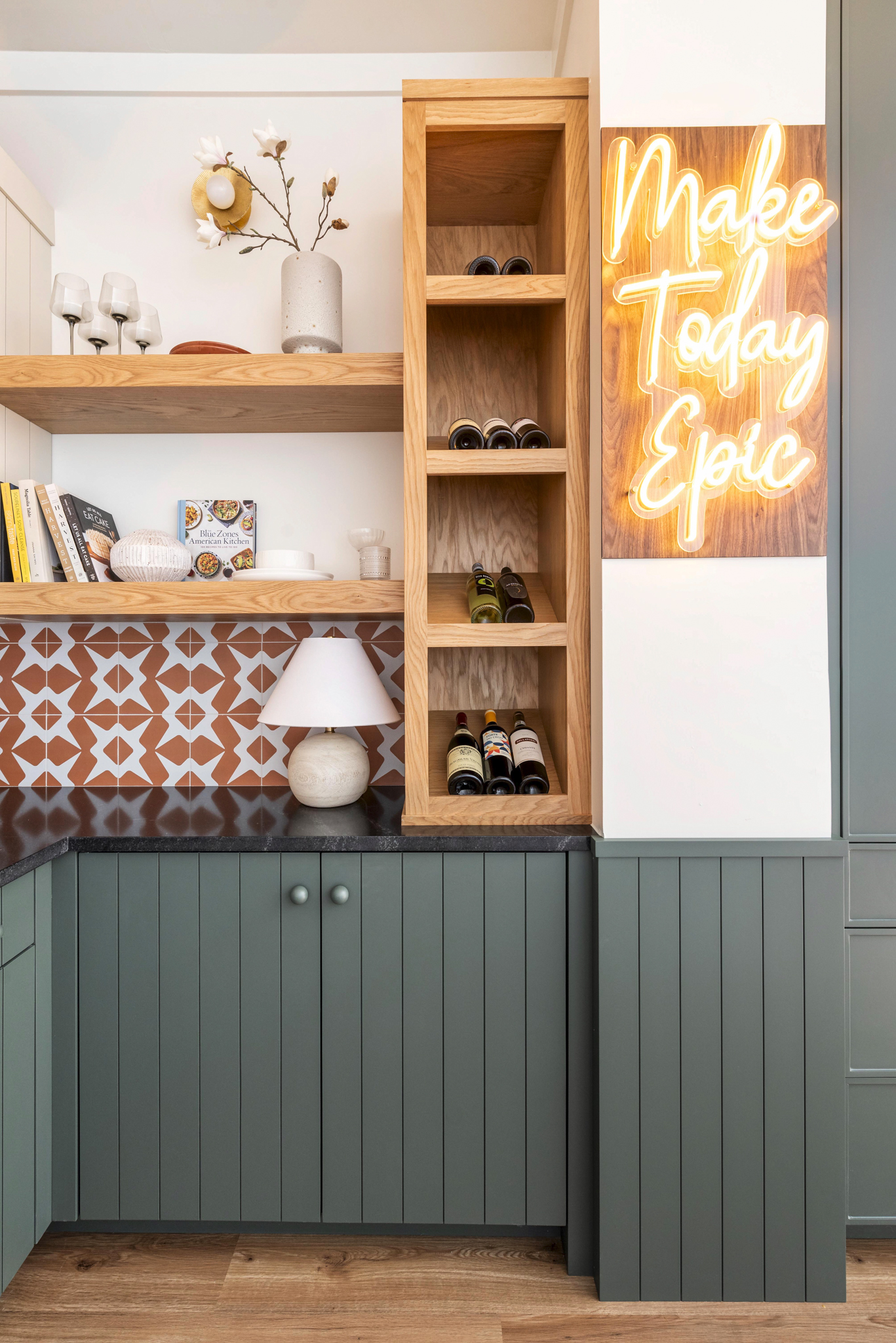 Walnut cabinetry with a green quartzite slab