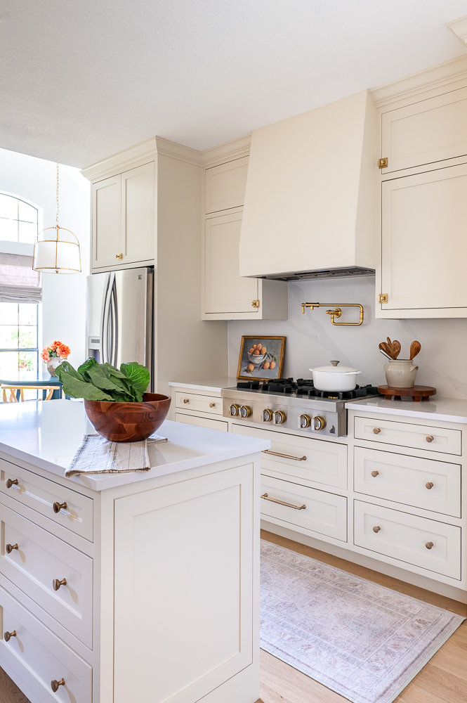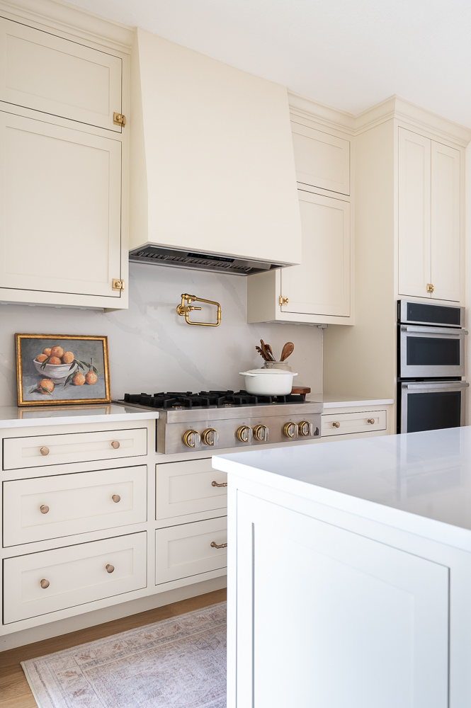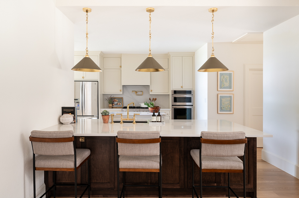 This kitchen underwent a major transformation. We opened up the wall between the kitchen and living room and installed a beam in order to open up the flow between the two spaces. Complete with an island with several deep drawers for pots and pans, and a custom stained peninsula with two panel ready dishwashers this kitchen has it all! The vent hood was done in a plaster finish to match the color of the creamy white cabinetry which complements the brass hardware and lighting perfectly.