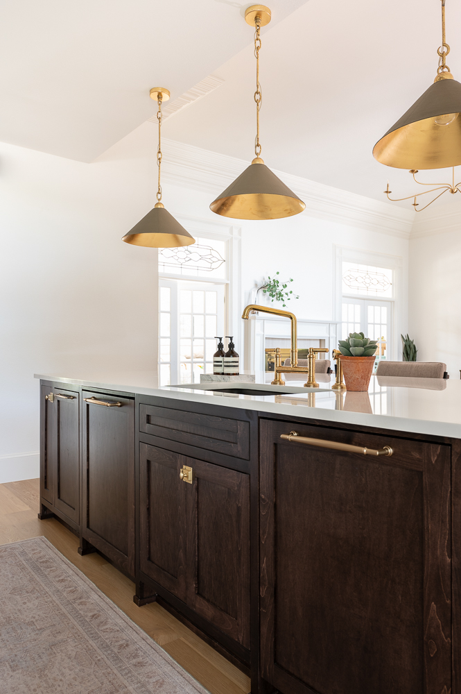 This kitchen underwent a major transformation. We opened up the wall between the kitchen and living room and installed a beam in order to open up the flow between the two spaces. Complete with an island with several deep drawers for pots and pans, and a custom stained peninsula with two panel ready dishwashers this kitchen has it all! The vent hood was done in a plaster finish to match the color of the creamy white cabinetry which complements the brass hardware and lighting perfectly.