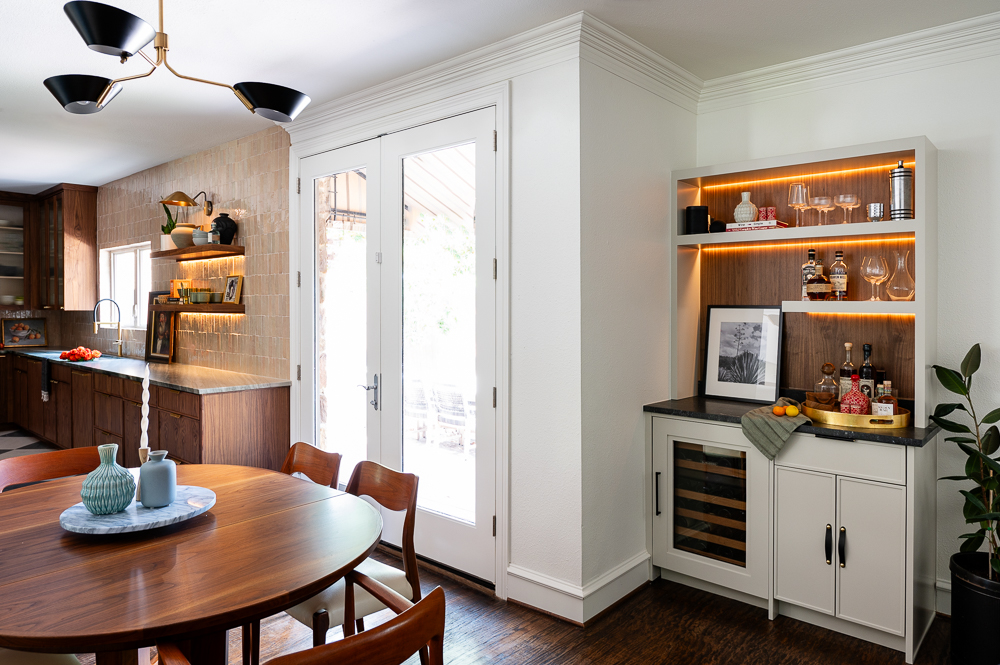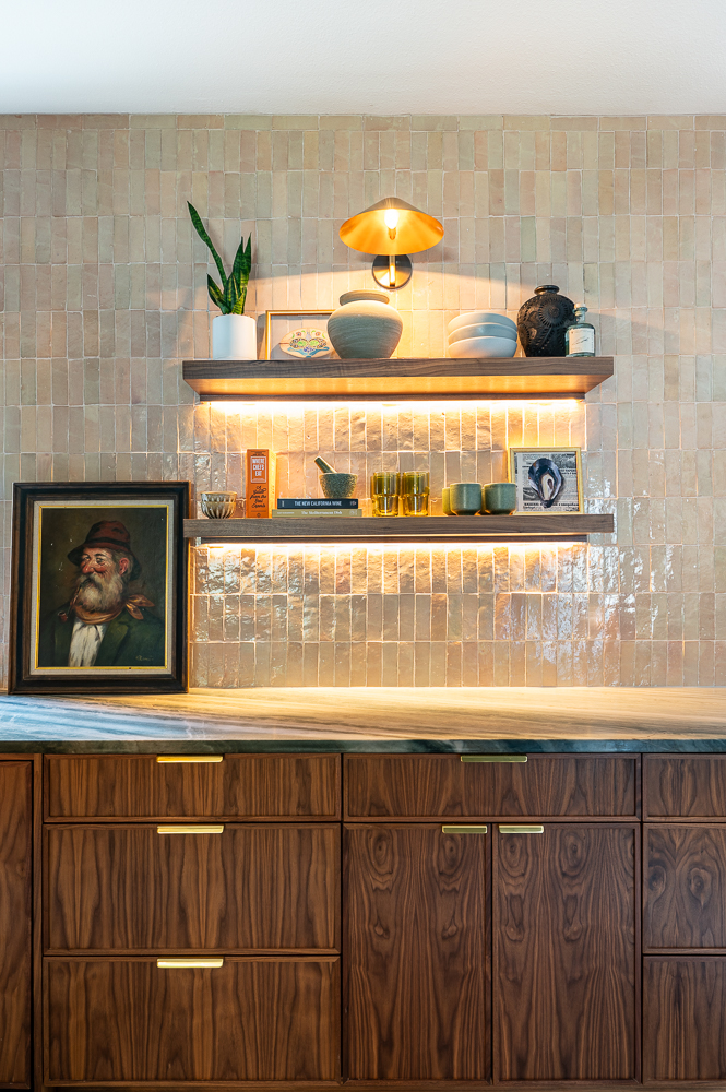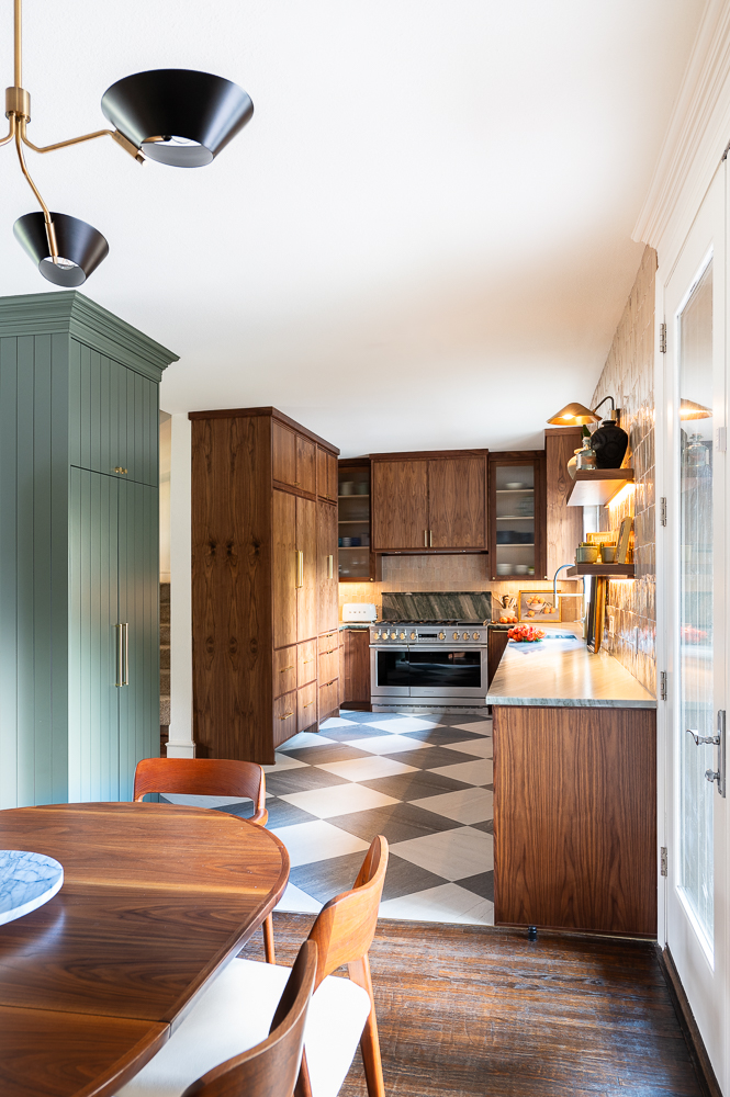 The walnut cabinetry in this mid-century inspired kitchen was the jumping off point for this remodel. The oversized checkered floor gives this otherwise smaller kitchen the illusion of grandeur. The green quartzite countertop and zellige backsplash tile are the perfect compliment to bring in the texture and visual interest to the space. This house already had great bones and plenty of character, we just helped bring it to the next level!