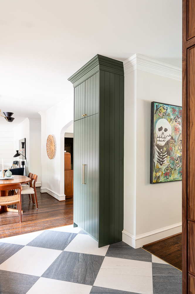 The walnut cabinetry in this mid-century inspired kitchen was the jumping off point for this remodel. The oversized checkered floor gives this otherwise smaller kitchen the illusion of grandeur. The green quartzite countertop and zellige backsplash tile are the perfect compliment to bring in the texture and visual interest to the space. This house already had great bones and plenty of character, we just helped bring it to the next level!